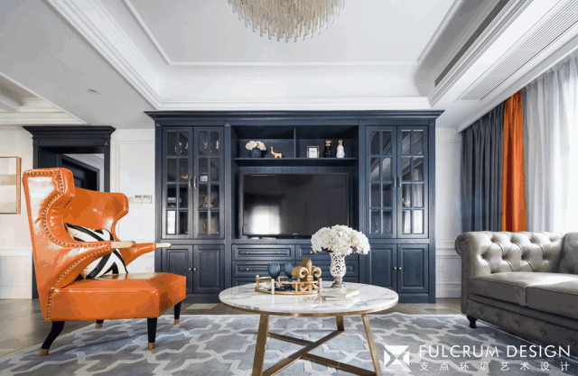 ? 空間的色彩方面我們以富于變幻的高級灰作為基調,素雅的色彩承載了優(yōu)雅穩(wěn)重的藏藍色家具,搭配靈動又熱情的愛馬仕橙皮面沙發(fā),使整個空間既清雅貴氣,又多了一份生氣和活力。